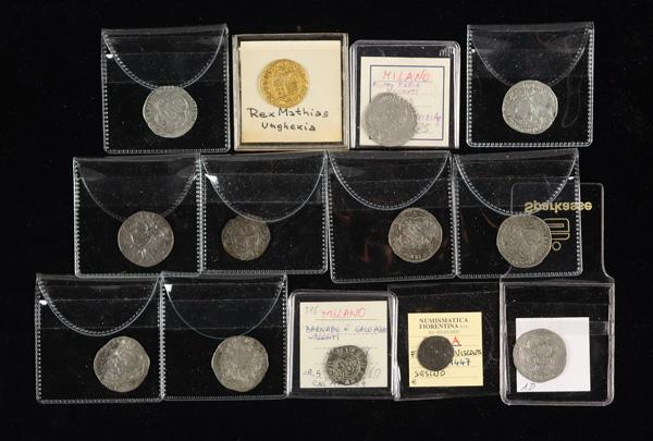 Europe (Western), Hungary and Italy Hammered Gold & Silver Coin Collection, 1300s-1500s, Lot of 13 Hammered European Silver and Gold coins, ca.1300-1500s, Includes a Matthias Corvinus (1458-1490) Gold coin the size of a U.S. $5 gold piece, VF-XF condition; early Italian hammered silver coins with 7 early Italian Milan. Bernabò & Galeazzo II Visconti (1355-1378) Pegione (Grosso of 1-1/2 Soldi) ND, Milan mint with condition from VG with bent planchet to VF; and additionakl coins that deserve further research (13 coins total). Shipping charges apply - weight 1 lbs. (Image)