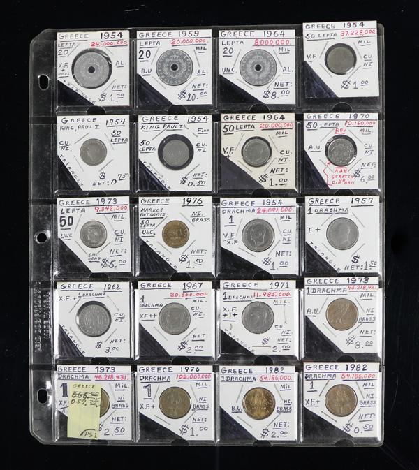 Greece Coin Collection, 1954-90, Greece, 1954-90. Lot of 66 Coins, Highlights Include: Bohemia/Moravia 50 Haleru, 1943; Greece 20 Drachmas (2), 1982-90; 50 Drachmas, 1990. Rest are Greek Coins and range from VF-Unc condition. (66). Sold "AS IS" no returns accepted. Shipping charges apply - weight 3 lbs. (PDF for this Lot) (Image)