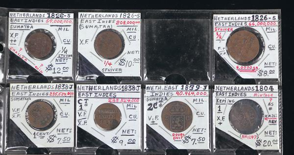 Netherlands Colonies Coin Collection, 1804-2004, lot of over 180 coins, all housed in 2x2 mounts with dates, quantities, and old prices on each label; condition ranges from VG to CU condition, highlighted by a group of Netherlands East Indies (Sumatra) coins dating from 1804 to 1942 (17 coins); Netherlands Antilles coins from 1952 to 1983; and dozens of other coins in Fine to Uncirculated condition; please inspect; too many are worthy of describing (180 + coins). Shipping charges apply - weight 5 lbs. (Video for this lot) (Image)