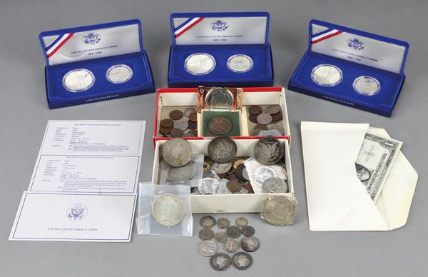 North America, U.S. & Canada Coin Eclectic Accumulation, 1840-1960s, interesting and exciting collection of dozens of coins with many surprises; highlights include a pair of 1924 and 1925 Peace dollars in Uncirculated to CU condition or better, 5 additional silver dollars that need inspection; $4.50 FV of 90% Silver Kennedy, Franklin and Walking Liberty halves; an early Canada Siver 5 Cents; 10 Cents & 25 cents (2) assortment in Fine to XF condition from 1872 to 1897; 1916 Mercury Dime in Choice Fine to VF; U.S., 1853 with arrows and an 1856 half dime pair, Fine to VF; 1841 Seated Liberty Dime; 3 different 1934 and 1953 $5 Silver Certificates and 4 $1 silver certificates, Fine to VF; 3 U.S. Statue of Liberty Commemorative Proof Sets, $1 Silver and 50 Cents Clad and dozens of other coins that deserve an quick look, other surprises await the diligent buyer; interesting and fun lot. Shipping charges apply - weight 4 lbs. (Image)