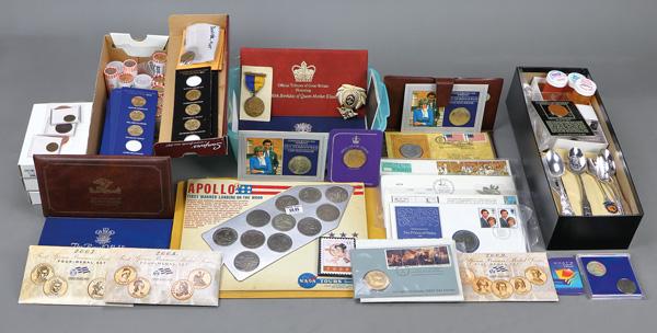 Worldwide Hodge Podge Coin Collection, Unsearched From an Old Estate, 1847-2009, hundreds of coins, unsearched other than for this very brief description; highlights include 2 different 1909 Hudson-Fulton Expo coins; an 1847 U.S. Large Cent in Choice Fine to VF condition; 3 different First Spouse Bronze Medal Sets of 4; 8 different ornate silver spoons, possibly sterling, with a weight of close to 3 ounces; Coin and currency covers for different world events; 12 uncirculated rolls of 25 coins of presidential, Statue of Liberty, and SBA $1 dollar coins; 3 uncirculated rolls of state quarters and hundreds of other coins, unsearched, please inspect, surprises await the diligent viewer (hundreds of coins with a face value of over $400). Shipping charges apply - weight 24 lbs. (Image)