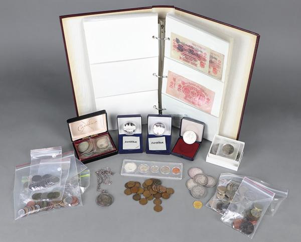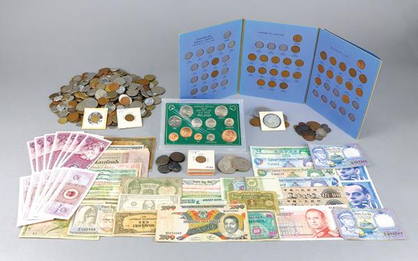 Worldwide, "Money Tree" Coins, Bank Notes, Notgeld, etc, 1890s-2000s, Approximately 200 coins in total, such as nine different 10DM coins from the 1972 Olympics in Munich, a 3RM coin from 1908 Wurttemberg, a 100sh coin from the 1976 Olympics in Innsbruck, various U.S. coins, like 30 Wheat Pennies, 5 Silver Dollars, and a 1965 Proof Set. Also, over 60 Bank Notes including some modern from Argentina, Chile, Indonesia, Singapore, Vietnam, and others, and many from the inflationary period in Germany and the Austro-Hungarian Empire following WWI, as well as 50 pieces of Notgeld, and two silver medallions produced by Intercoin in Germany for Christmas 1979 & 1980, overall Fine to Very Fine, additional images online. Shipping charges apply - weight 7 lbs. (Video for this lot) (Image)