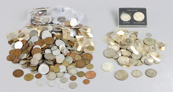Worldwide, Hodgepodge of Foreign Silver & Non-Silver Coins, some countries include: Canada, Panama, Australia, Great Britain, Mexico & many more; there are Canada Silver Dollars, Mexico Silver Pesos, & much more silver; hundreds of non silver coins in the group as well; many different denominations; condition varies; please inspect; plenty of surprises throughout (300+). Shipping charges apply - weight 11 lbs. (Image)