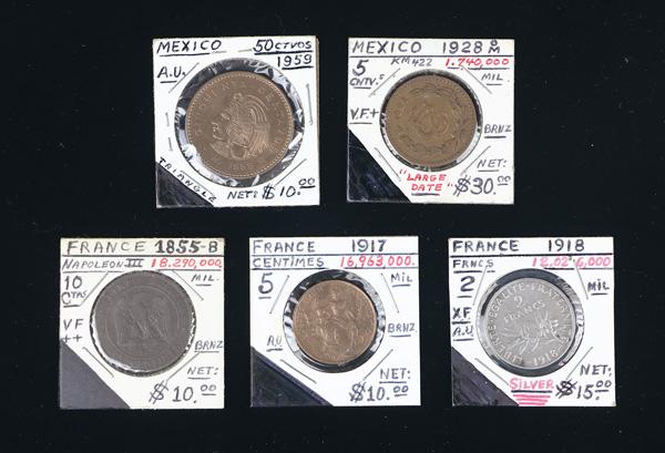 Worldwide, Collections of France, Mexico & Great Britain Coins, 1854-2004, lot of over 240 coins; the collection includes over 100 coins from Mexico dating from 1906 to 1998, 1 centavo to 5 New Pesos, condition varies between VF to CU condition; France consists of over 85 coins dating from 1854 to 1997, including the denominations 1 centime to 2 Francs, Fine to AU-Unc.; and, Great Britain, lot of over 60 coins dating from 1937 to 1959 with the denominations of Farthing to 3 Pence, with condition ranging between Fine to Uncirculated condition, attractive collections that is unsearched from an old estate (240+ Coins). Shipping charges apply - weight 7 lbs. (PDF for this Lot) (Image)