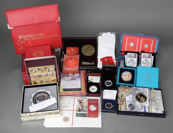 Collection of Chinese & Worldwide Coins & Medallions, collection includes: 2015 Year of the Goat jade and silver coin (2), 2016 Year of the Monkey jade and silver coin (2) 2016 "Mirror Monkeys" Tokelau silver coin, 2016 Panda-Moon Festival Medal graded as PF-70 by NGC, gold-plated Chinese New Year celebration stamps, Lunar New Year coin collection in binder, 2016 Canadian Royal Mint Tiger and Dragon Ying Yang coin, the Perth Mint Australian Opal Lunar Monkey (2), various American Mint tokens, and a great variety of other Chinese coins, worldwide tokens, and some U.S. coins; a large and diverse lot with some notable silver content. Shipping charges apply - weight 17.6 lbs. (Image)
