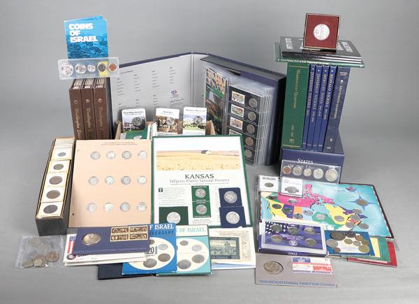 Worldwide Coins & Currency, Including USA Silver, the remnants of an estate, all coin or banknote related and worldwide in scope; starts with (4) Commemorative Silver Half Dollars including: a 1925 50C Lexington NGC AU Details - Cleaned; a 1964 Uncircualted Set, a 1936 Uncircualted Set, a 1950-S/S 25C ANACS NET EF45 Counting Wheel Quarter Damage; then 4 Whitman folders including Buffalo Nickels 1913-1938 (only 2 coins), Jefferson Nickels 1938-1964 (50 coins, including a few that look close to UNC), Jefferson Nickels 1965- (24 coins), Mercury Dimes 1916-1945 (26 coins, $2.60 silver face) 5 different Israel mint sets (1967, 1968, 1979, 1981, type sets (these typically retail at $10-$15 each)l a 1.1 ounce medal in box (unawarded) marked .999 fine silver along the edge) (2) Complete Dansco Album Of WAshington Statehood Quarters 1999-2003 & 2004-2008 including proofs; a Complete Dansco Album Of Washington Statehood Quarters 1999-2008; a Littleton Album Of Washington Quarters 1932-1967 partially complete (23 90% silver quarters); Statehood Quarters; 50 State Quarters Greetings From America Portfolio Album Complete; States Of The Union album PCS Stamps & Coins; a box of worldwide coins in 2x2's (earliest spotted was 1890, some as recent as the 1970s; approx 125 coins, some priced as high as $10); approximately 15 worldwide banknotes including 3 Military Payment Certificates mostly from the 1920s-1940s; unchecked for better items; should be a good inexpensive afternoon of fun; $73 of melt value in addition to all the other goodies; some surprises throughout please inspect. Shipping charges apply - weight 32.8 lbs. (Image)
