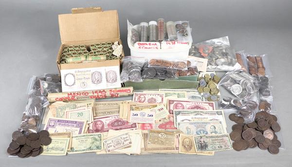 Worldwide Coin & Currency Assortment; Tail End Of A Dealer Stocker, includes: quantities of Mexico, Haiti, Trinidad & Tobago, and many other countries that are too many to list; inspection is a must for this lot; excellent oppurtunity for the treasuer seeker. Shipping charges apply - weight 52 lbs. (Image)
