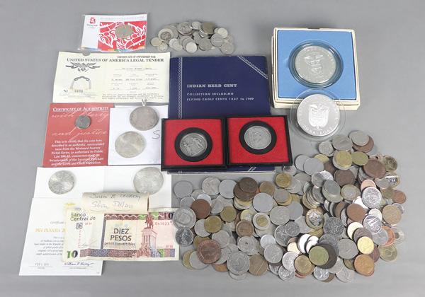 Collection of Worldwide Currency and Coins, includes: assortment of worldwide "first day of issue" coin covers, three U.S. silver certificates alongside various other banknotes, various Reader's Digest Presidential Tokens, United States Mint commemorative medallions and coins, United States Mint uncirculated coin sets, Vatican City coins, Bicentennial commemoratives in cases, and more. Shipping charges apply - weight 17.6 lbs. (Image)