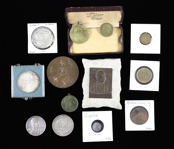 Group of Zeppelin Related Silver Coins, Non-Silver Coins & a Bronze Plaque, includes: a 1924 Germany Silver Medal Zeppelin To Los Angeles America, Dr. Hugo Eckener; 1929 Germany Silver Medal Eckener & Dürr Zeppelin World Tour; GERMANY. Dr. Hugo Eckener silver Medal commemorating the world tour of the LZ 127 Graf Zeppelin; a Bronze Plaque Of Ferdinand Von Zeppelin Airship 1908 Paperweight Stone; Georges Lemaire 1900 Paris Universal Expo Bronze Medal w/ Zeppelin On Reverse; a France, Token, Collection Shell, Graf Zeppelin, Bronze-Aluminium; a Dock Goodyear Zeppelin Token, with a hole in it; a Zeppelin + Balloon coin with tree on reverse; a Zeppelin aluminum token; plus a few extra coins as a bonus (10 items). Shipping charges apply - weight 1.2 lbs. (Image)