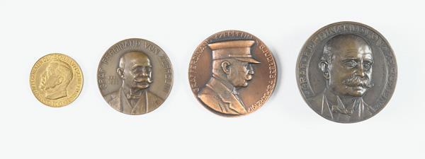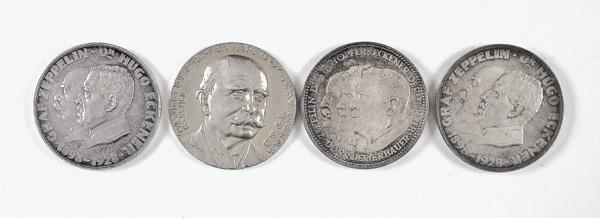 Group of (4) Graf Zeppelin Related Medals, 1909-1930, includes: 1909 Graf Zeppelin Test Flight Bronze Medal, 1909 Germany-Empire Kaisereich Karl Goetz Zeppelin Fernhart Bronze 64.55mm Medla, a 1924 American Flight Of Zeppelin Large 60mm Bronze Medal, & a 1930 Germany Wiemar Zeppelin First Equator Ride Brass Medal (4 items). Shipping charges apply - weight 0.8 lbs. (Image)