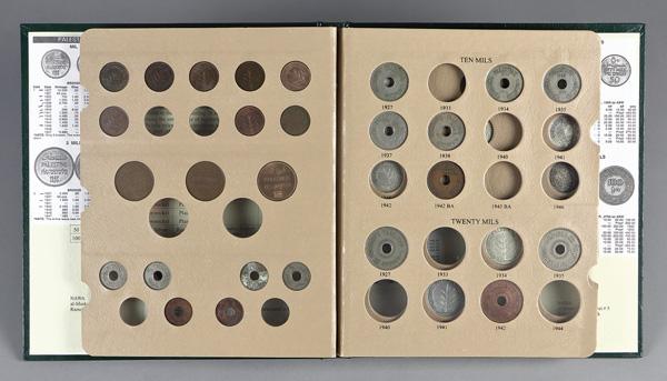 Palestine British Mandate Partially Filled Albu, 1927-1946, total of 34 coins; consists of: (8) One Mil (3) Two Mils (6) Five Mils (6) Ten Mils (3) Twenty Mils (6) Fifty Mils, & (2) One Hundred Mils; please inspect; condition ranges from Fine-AU (34 coins). Shipping charges apply - weight 1.4 lbs. (PDF for this Lot) (Image)