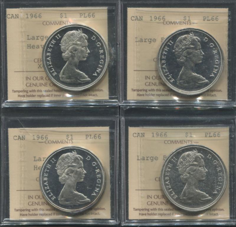 Canada 1966 Silver Dollars ICCS PL 66 Large Beads Heavy Cameo. 4 Gem PL Silver Dollars, All ICCS PL 66, 2 being Heavy Cameo and 2 Cameo. Super quality. (Image)