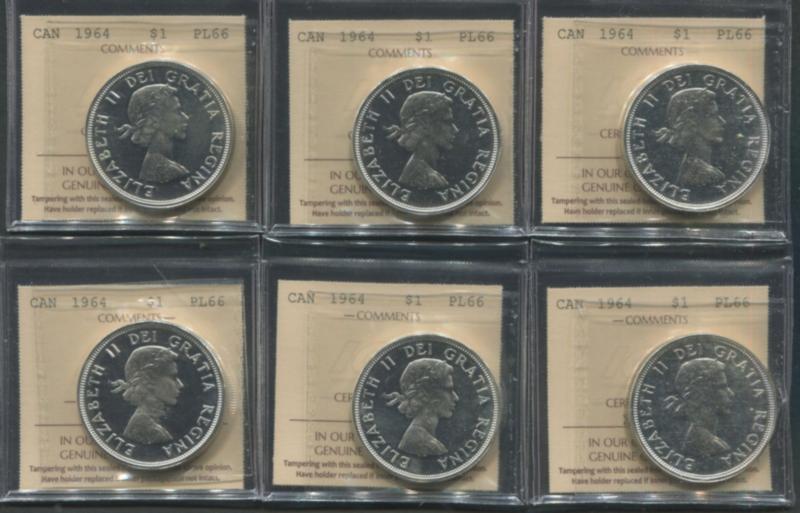 Canada 1964 PL Silver Dollars ALL ICCS PL66. A group of 6 1964 ICCS graded silver dollars, all superb gem quality. (Image)