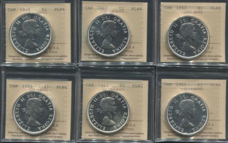 Canada 1963 Silver Dollars ICCS PL66. Consists of 6 1966 PL silver dollars, all graded ICCS PL66. Gem superb. (Image)