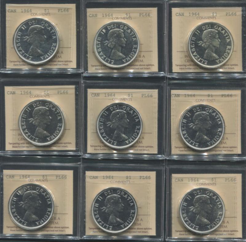 Canada 1964 PL Silver Dollars ALL ICCS PL66. A group of 9 1964 ICCS graded silver Dollars, all superb gem quality. (Image)