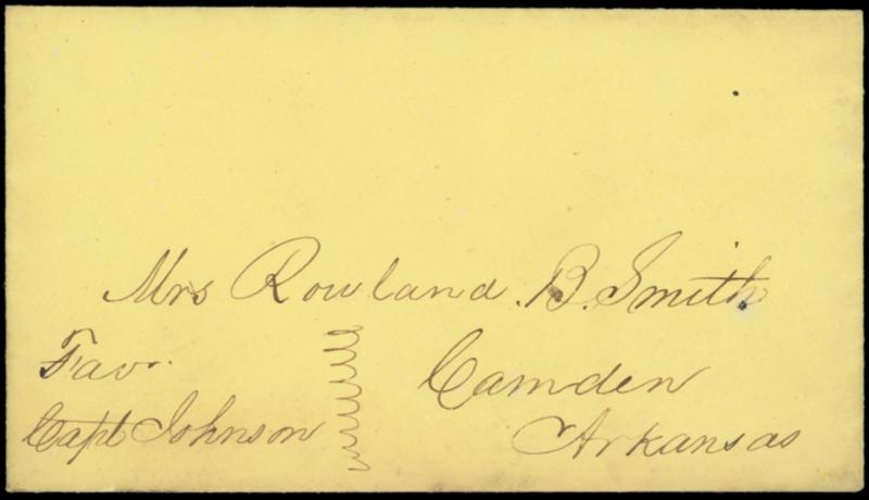 Col. Henry Poston Johnston, CSA. Yellow cover to Mrs. Rowland B. Smith, Camden, Arkansas endorsed "Favr. Capt Johnson", fresh and Very Fine. Estimate; $75 - 100. US$75-100 (Image)