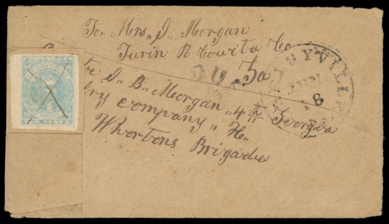 1863, 10¢ blue. Large margins tied by "Atlanta Ga., Jul 30" cds on circa 1864 homemade brown cover to the wife of General Robert Toombs at Washington Ga. in his hand, F.-V.F. Scott No. 11; Estimate $100 - 150.