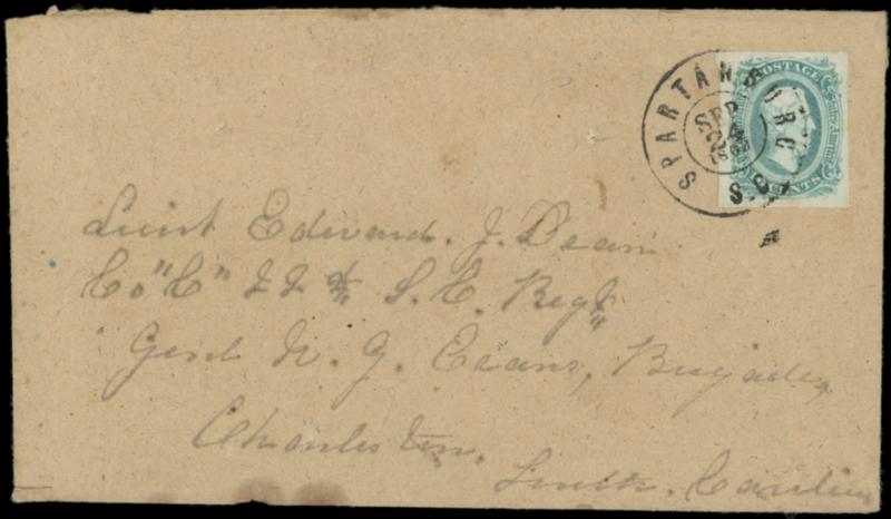 1863, 10¢ blue. Large even margins, bright and fresh, tied by sharp "Spartanburg S.C. Sep 24, 1863" cds on brown homemade cover with military address to Lieut. Edward J. Dean, Co. C, 22nd S.C. Regt., Genl. N.G. Evans Brigade, Charleston S.C., Very Fine. Scott No. 11; Estimate $100 - 150.