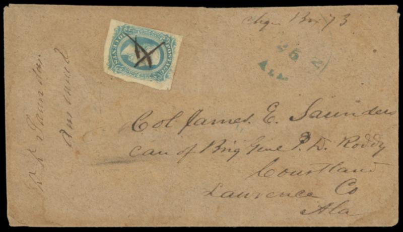 1863, 10¢ blue. Four margins, pen canceled, partial blue "Auburn Ala. 25" cds on homemade brown cover with military address to Col. James E. Saunders, Care of Brig. Genl. P.D. Roddey, Courtland, Lawrence Co., Ala., docketed "D.H. Sunders, Answered." at left; flap flaws, F.-V.F.,ex-Ballard. Scott No. 11; Estimate $100 - 150.
