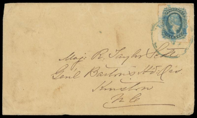 1863, 10¢ blue. Large margins, tied by blue "Ashboro N.C., Jun 7" cds on homemade cover with military address to Lt. Col. A.C. McAlister, 46th Ret. N.C.I., Cooke's Brig., Richmond Va.; some ink offset and ton spot at left, F.-V.F. Scott No. 11; Estimate $75 - 100.