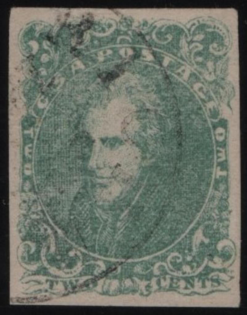 3 XF 2¢ green Jackson, light cds cancel, couple small thin spots, light crease, four equal margins (Image)