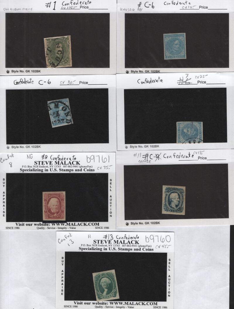 Group (7) stamps & (1) cover, */O incl cover w/ #1 tied by Charleston SC, Dec 12, 1861 cancel, addr to Camden SC; incl Used sgls #1 (flts) stuck to piece of album page, 6 w/ Richmond 1862 cancel; Unused incl 6, 8 NG, 13; cond F-VF to VF-XF (Image)