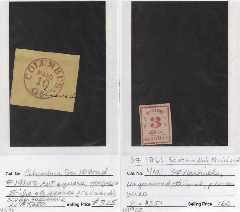 Group (6) */O Postmasters Provisionals on (P Kaufmann) dealer pages w/ ID; incl unused #4AX1 Nashville, ungummed, thinned, PMG; 19XU2 Columbus GA cut square; 47XU1 Knoxville cut square w/ 1980 CSA & 1980 PF Certs; 56X2 Memphis tied to piece of cover, stamp clipped at LR; 58X2 Mobile, tied to cover piece by SEP4 1861 cds; 68XU1 Raleigh cut square w/ blue cds at left; marked retail $1,435; cond varies, most sound, gen F-VF (proceeds benefit Stamps For The Wounded) (Image)