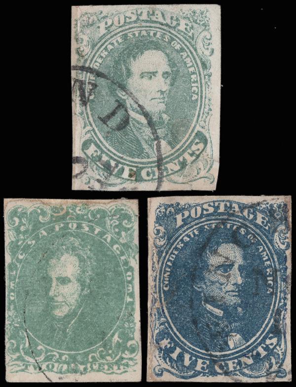 1861, 5¢ green, 2¢ green & 5¢ blue (Scott 1, 3, 4), fresh, attractive used singles; each with a margin repaired the #1 also with a repaired corner, Very Fine appearance. Scott $1,075. (Image)