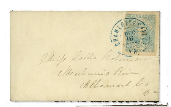 1861, 10¢ blue, Paterson printing (Scott 2), stamp with four full largin margins all around, tied to small ladies cover with blue Charlottesville, VA Dec 16, 1862 postmark, addressed to Mechums River, Albemarle Co., Va; stamp has tiny corner crease at upper right, Very Fine. Scott $325. (Image)
