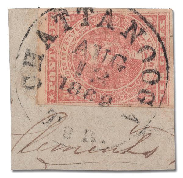 1862, 10¢ rose (Scott 5), clear to mostly large margins, tied on a small piece by a clear "Chattanooga, Ten., Aug, 12, 1862", nearly Very Fine and quite attractive. Scott $400. (Image)