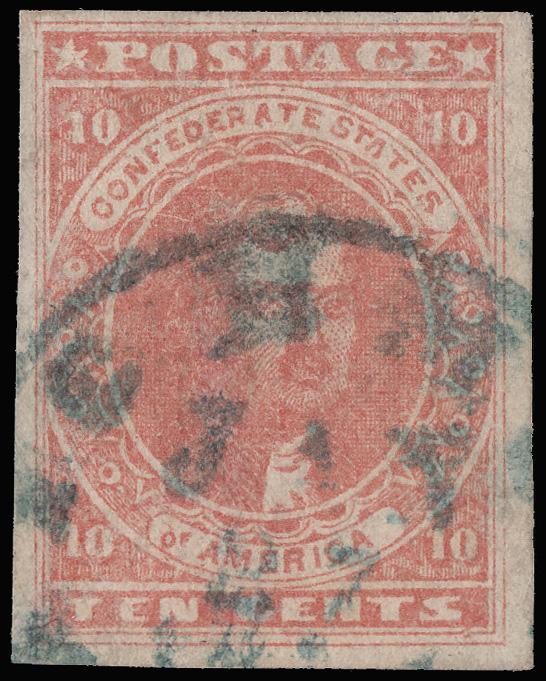 1862, 10¢ rose (Scott 5), ample to large margins with a blue Jan 27 Richmond c.d.s., Very Fine. Scott $450. (Image)