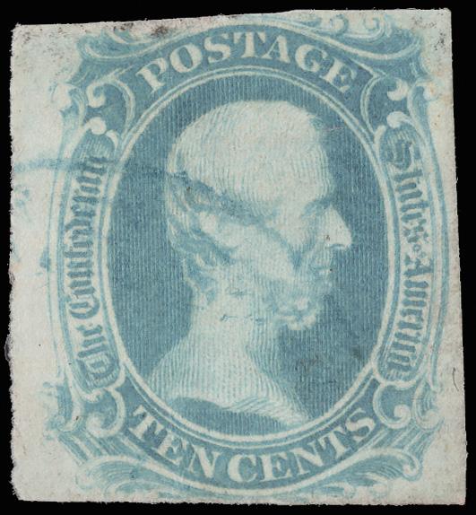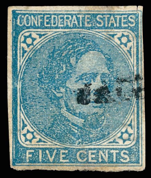 1862, 5¢ blue, Archer & Daly printing (Scott 7), four-margined example with filled frame at left, cancelled by Type II small JACKSON MISS straightline (CSA #SL-07C); minor corner fault at top right, Fine to Very Fine, a quite uncommon cancel, appearing in late May 1863 and in use for only a few weeks. C.S.A. Catalog 7-R-v2; $500 for cancel. Scott $22. (Image)