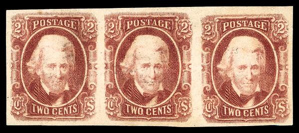 1863, 2¢ brown red (Scott 8), horizontal strip of 3, full margins all around, o.g., hinged, Very Fine. Scott $250. (Image)