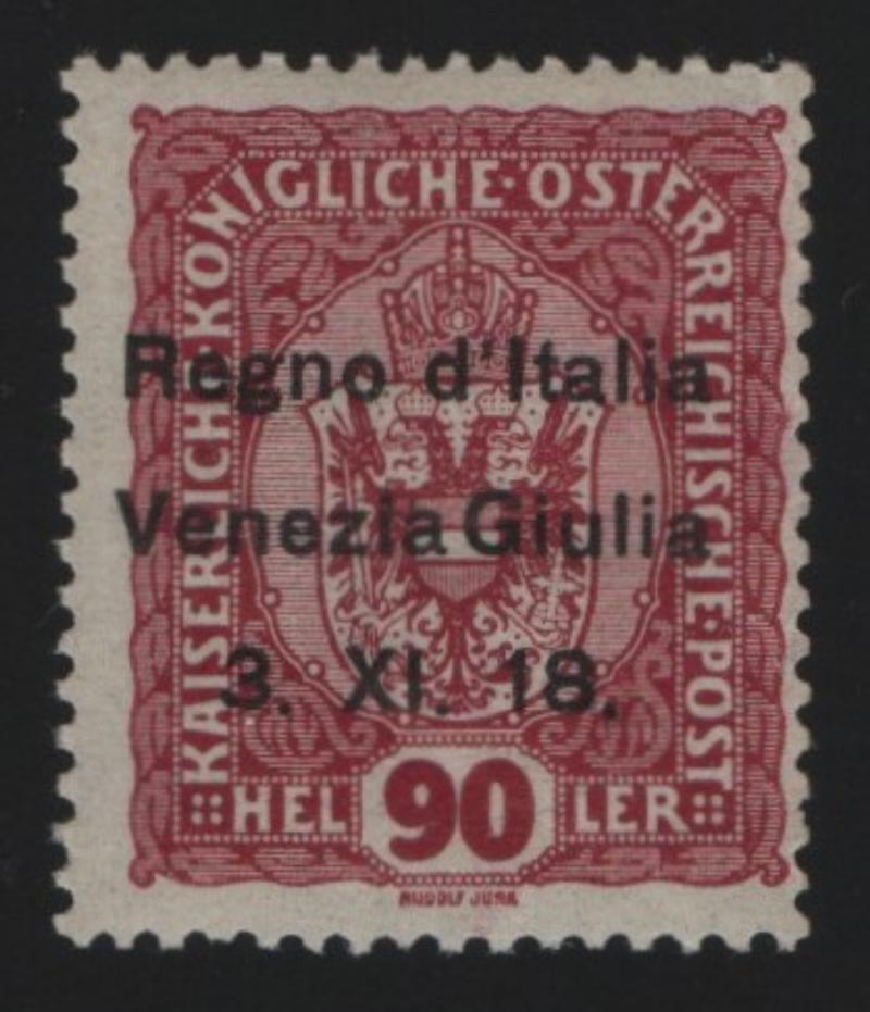 Italian Occupation of Trieste, unissued Austrian Coat of Arms 90h lake w/ black "Regno d'Italia / Venezia Giulia / 3. XI. 18." Ovpt; only one sheet of (50) was overprinted, this is position 20, per 1954 Guglielmo Oliva Cert; signed in pencil, NH, Cert states fault-free but since 1954 there appeared an UR corner crease; F-VF, footnoted in Scott (Sassone 17A €26000) (Image)