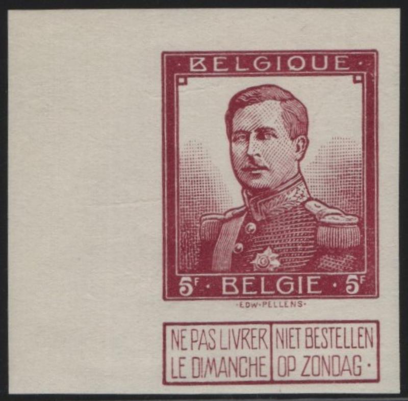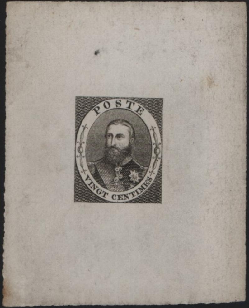 Black engraved essay of King Leopold II in uniform, text in oval "Poste / Vingt Centimes" on white proof paper, minor soiling at edge, gen VF (Image)