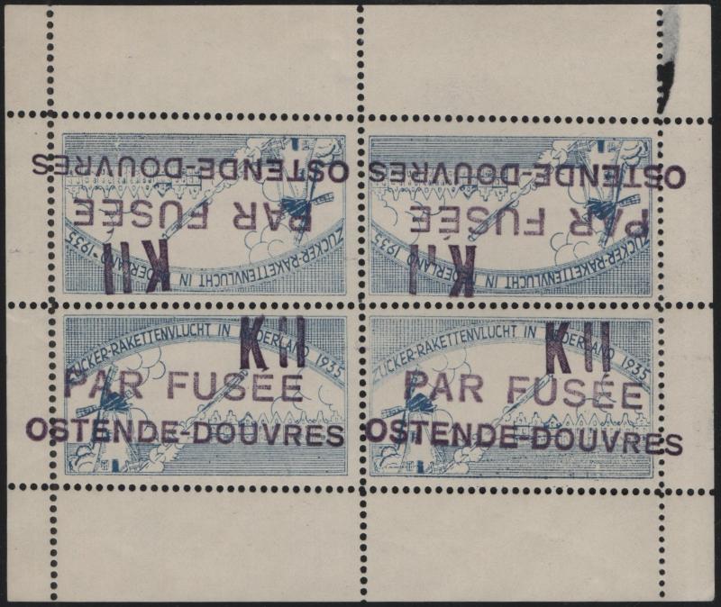 1935 Rocket Mail stamp in tete beche sheet of (4), perf, w/ "K11" Ovpt, signed on reverse by Zucker, fault in corner selvage piece, only (290) stamps produced, 1967 E-Z #2A1a $90, F-VF NH (Image)