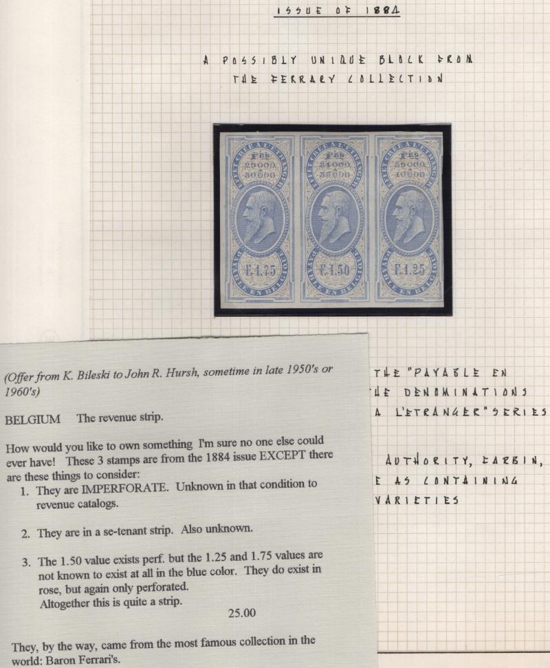 Collection Unused 19th Cent Revenues; Imperf sheet (25) 11c rose Affiches (Forbin 7B), rare as multiple; 1857 Bill of Exchange red imperf strip/5 3.50fr to 4.50fr se-tenant (Forbin 53-57); 1862 Bill of Exchange on blue paper, two se-tenant imperf blocks of (10) w/ 10c to 9fr values (Forbin 75-94); (30) diff 1884 Bill of Exchange in blue, payable in Belgium, 10c to 20fr; unlisted imperf strip/3 1.25fr, 1.50fr & 1.75 se-tenant, two values are unknown!; (28) diff 1884 Bill of Exchange in rose, payable overseas, 5c to 10fr; Strip/7 1891 Bill of Exchange in ultra 11fr to 20fr se-tenant; "Timbre de Dimension" red handstamps on pieces of documents (5) diff, each also w/ albino impression of Belgian lion; "Timbre Proportional" similar red handstamps on pieces of documents (3) diff values, two w/ additional embossed lion; many w/ notations from Bileski that these originated from the Ferrary collection & are scarce; attractive group, gen F-VF (Image)