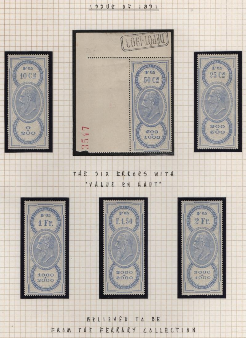 Complete Set (6) Revenues w/ values at top of stamp (error), Bill of Exchange, payable overseas, series of 1891, incl 10c, 25c, 50c, 1fr, 1.50fr & 2fr all ultra (Forbin 273a-278a); on album page stating from the Ferrary collection, F-VF (Image)