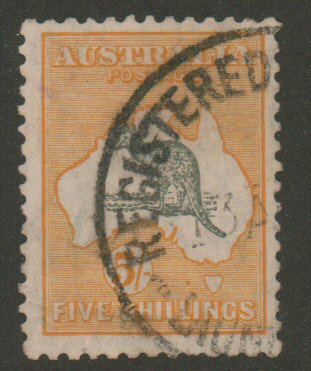 Australia, 1918 5/- Kangaroo, Scott 54, Watermarked Narrow Crown and Narrow A. Used, bright and fresh, used, Very fine centering, Scott $100. - estimate $30 - 44. (Image1)