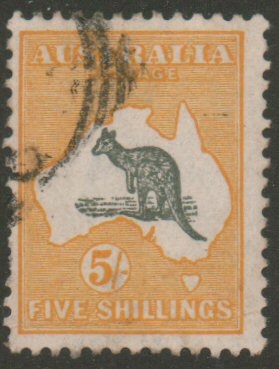 Australia, 1915 5sh yellow and grey Kangaroo and Map, Scott 44, used, very fine centering, Scott $300. - estimate $75 - 100. (Image1)