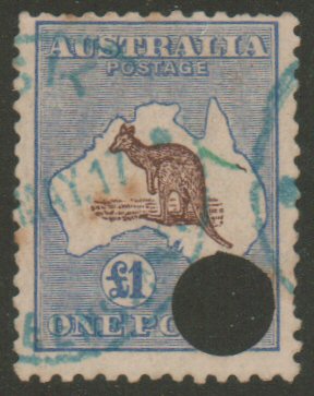 Australia, 1918 £1 Ultramarine & Brown Kangaroo, Scott 56, used punched copy with blue CDS, space filler, catalog for sound is $1,750. - estimate $75 - 100. (Image1)