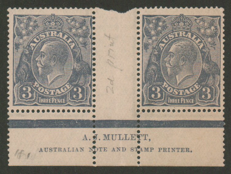 Australia, 3d blue Mullett Imprint gutter pair, Scott 30 never hinged, Scott $114. - estimate $50 - 75. (Image1)