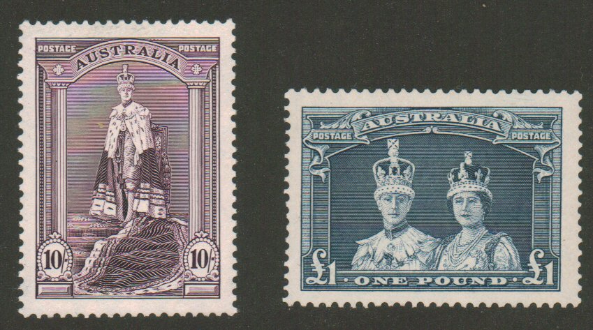 Australia, 1938, 10/ and £1 Coronation Robes, Scott 178-179 high values, mint og, lightly hinged, very fine, Scott $98. - estimate $26 - 34. (Image1)