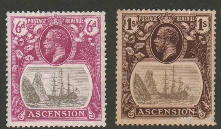Ascension, 1924-33, 6p Rose Lilac & Gray, 1sh Brown & Gray, Scott 17 and 19, mint og lighly hinged, Scott $87.50. - estimate $22 - 30. (Image1)