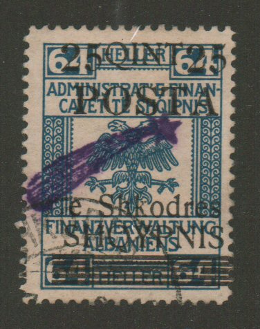 Albania, 1919, 25q on 64h blue used Scott 102,, very fine, scarce, Scott $140. - estimate $36 - 48. (Image1)