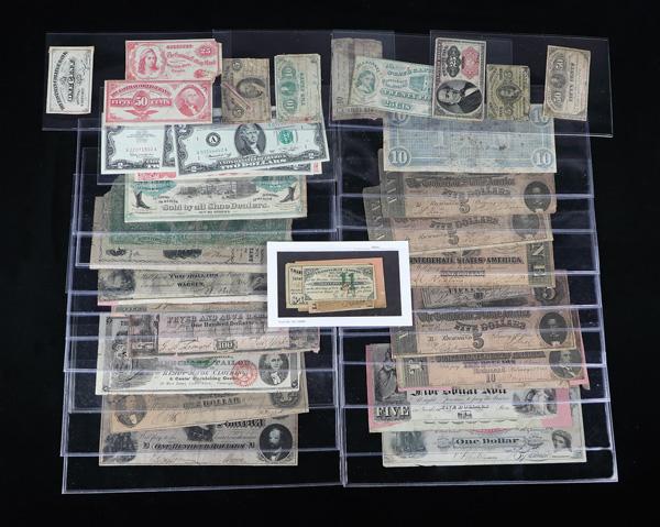 U.S. Obsolete, Advertising, Confederate. Fractional, College Currency and Ephemera Collection. 1860-1976, outstanding collection of various areas of U.S. currency highlighted by 5 different circa 1870-80s Eastman College Bank, Poughkeepsie, NY, 1 cent to $1; 11 different C.S.A. notes dating from 1862 to 1864; advertising notes are highlighted by C.A. Little & Co., "Tipped Boots & Shoes", and C.A. Leonard, Proprietor of the South American Fever and Ague Remedy, NY, ca.1850-60s (needs restoration); Scrip Notes feature an 1862, Wyoming County, PA., Pittston Bank, 5 Cents, S. Vernoy, Merchant, and Eby & Kunkel, 1862, 25 Cents, State Capital Bank, Harrisburg, PA.; 2 different Honesdale ca.1838 & 1862 Scrip note pair; Greensborough, Maryland, 1863, Issued Farmers Merchant Bank, $5; 1896, $1, Educational Silver Certificate, in Almost Good condition; and a few miscellaneous items; interesting and worthwhile lot for the beginning to advanced collector or dealer with a wide variety of useful and some desirable banknotes (40). Shipping charges apply - weight 2 lbs. (PDF for this Lot) (Image)