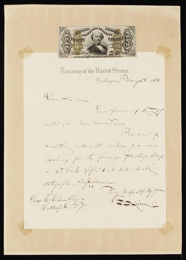 Third Issue 50 Cents Fractional Currency Red Back Hand Signed Fr#1328 Accompanied By Letter Signed by Spinner, from 1866; the fractional note was given as a gift in exchange for foreign postage stamps according to the letter; very interesting piece; extremely rare; must have for any currency collector. Shipping charges apply - weight 1 lbs. (Image)
