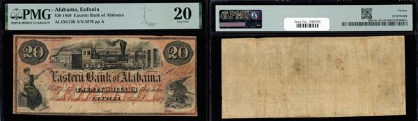 Eufaula, Alabama - Eastern Bank of Alabama $20 Sep. 3rd, 1859 G12b PMG Verry Fine 20 (Haxby-G12b), PMG graded Very Fine 20. (Image)