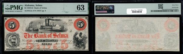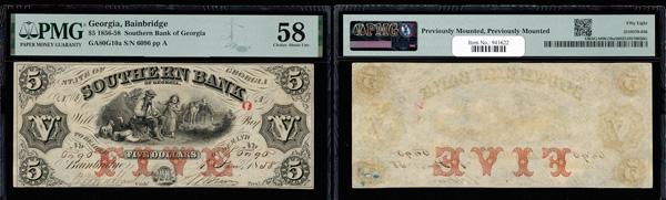 Bainbridge, Georgia - Southern Bank of Georgia $5 Jan. 1, 1858 G10a PMG Choice About Unc 58 (Haxby-G10a), previously mounted, PMG graded Choice About Uncirculated 58. (Image)
