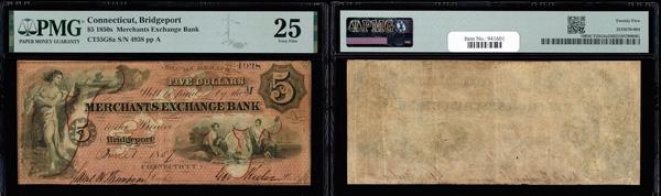 Bridgeport, Connecticut - Merchants Exchange Bank $5 June 1, 1857 CT-55 G8a PMG Very Fine 25 (Haxby-G8a), PMG graded Very Fine 25. (Image)
